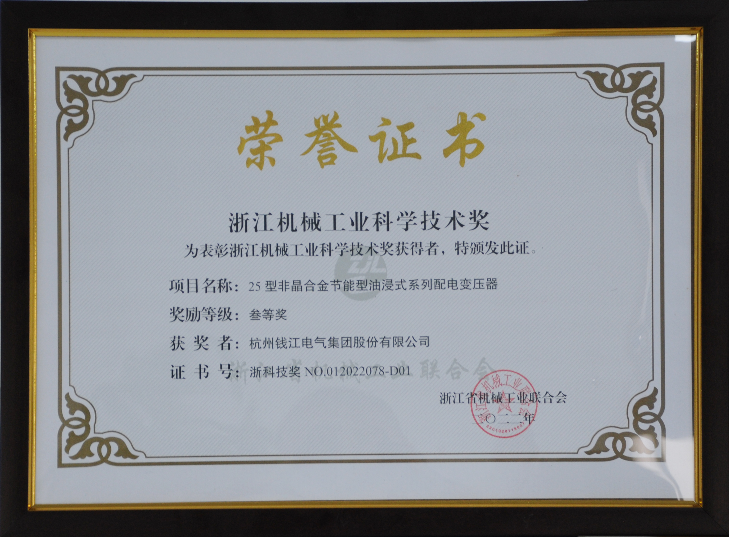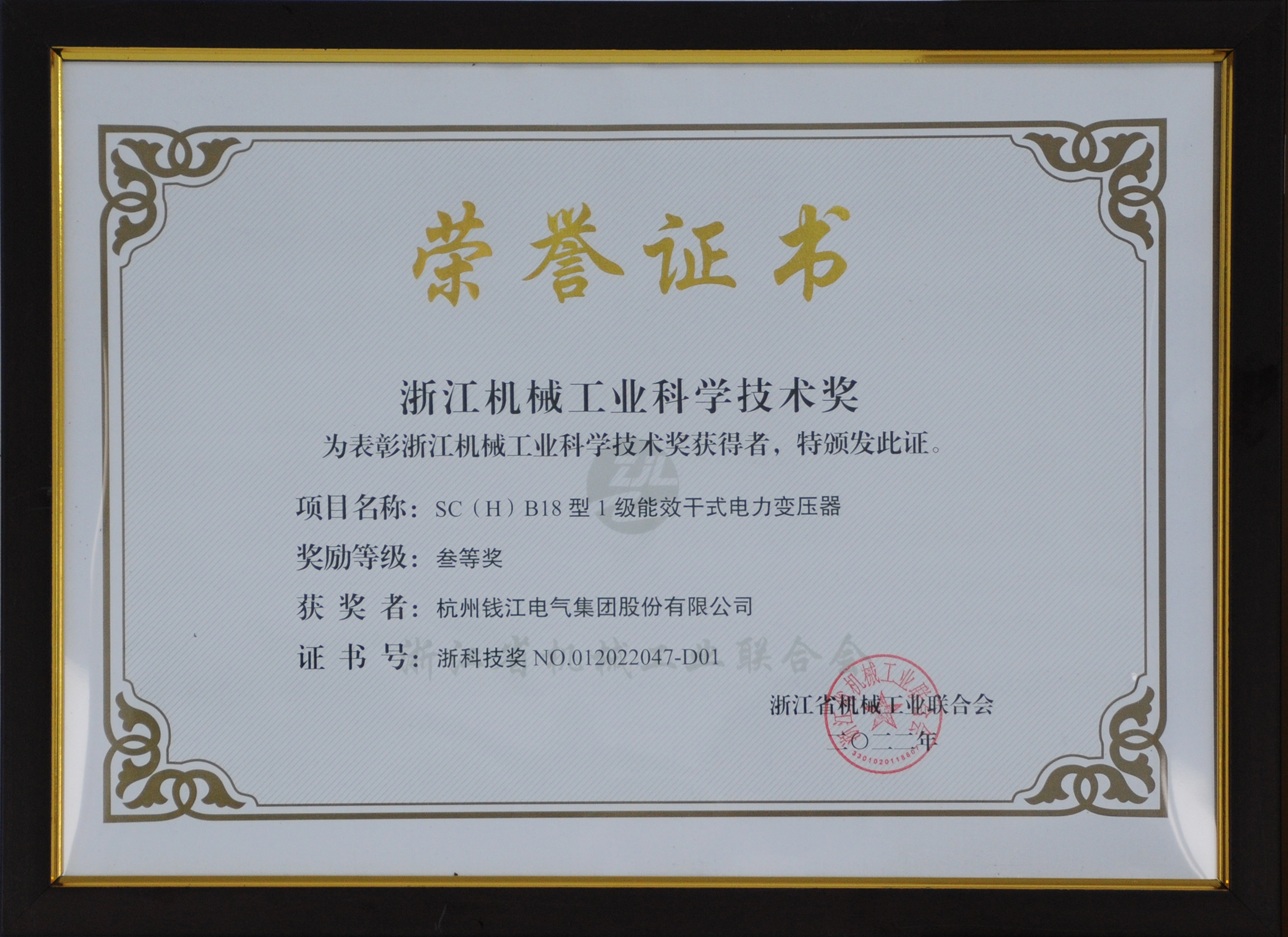 近日,在浙江省機械工業聯合會五屆五次會員代表大上,我公司研發的SC(H)B18型1級能效干式電力變壓器和25型非晶合金節能型油浸式系列配電變壓器,獲2022年度浙江機械工業科學技術獎三等獎。